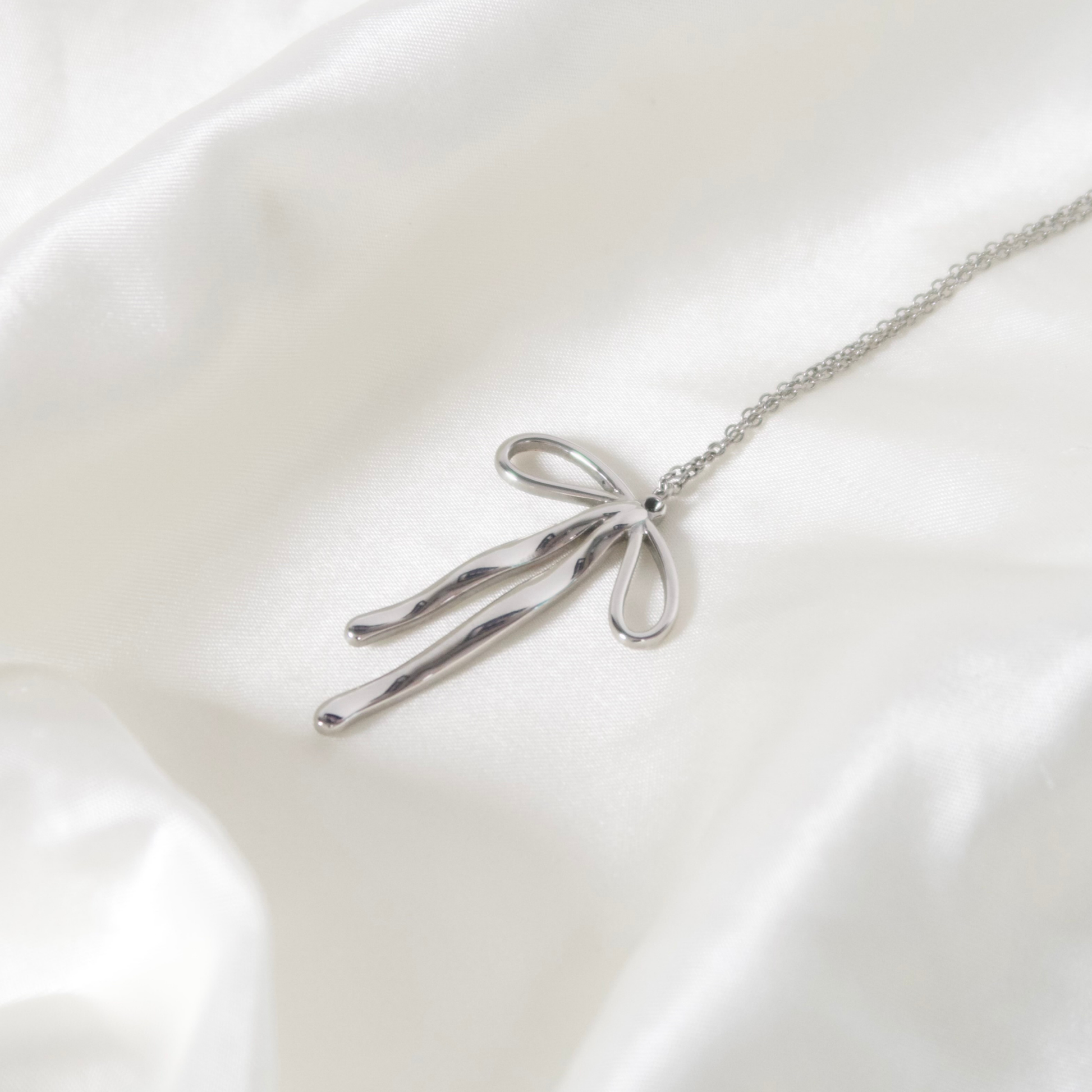 Our Ribbon Necklace in Silver is the perfect statement necklace to tie playful charm to any outfit. The delicate ribbon design adds a dreamy twist to the classic silver necklace- a shining touch of elegance for any outfit.